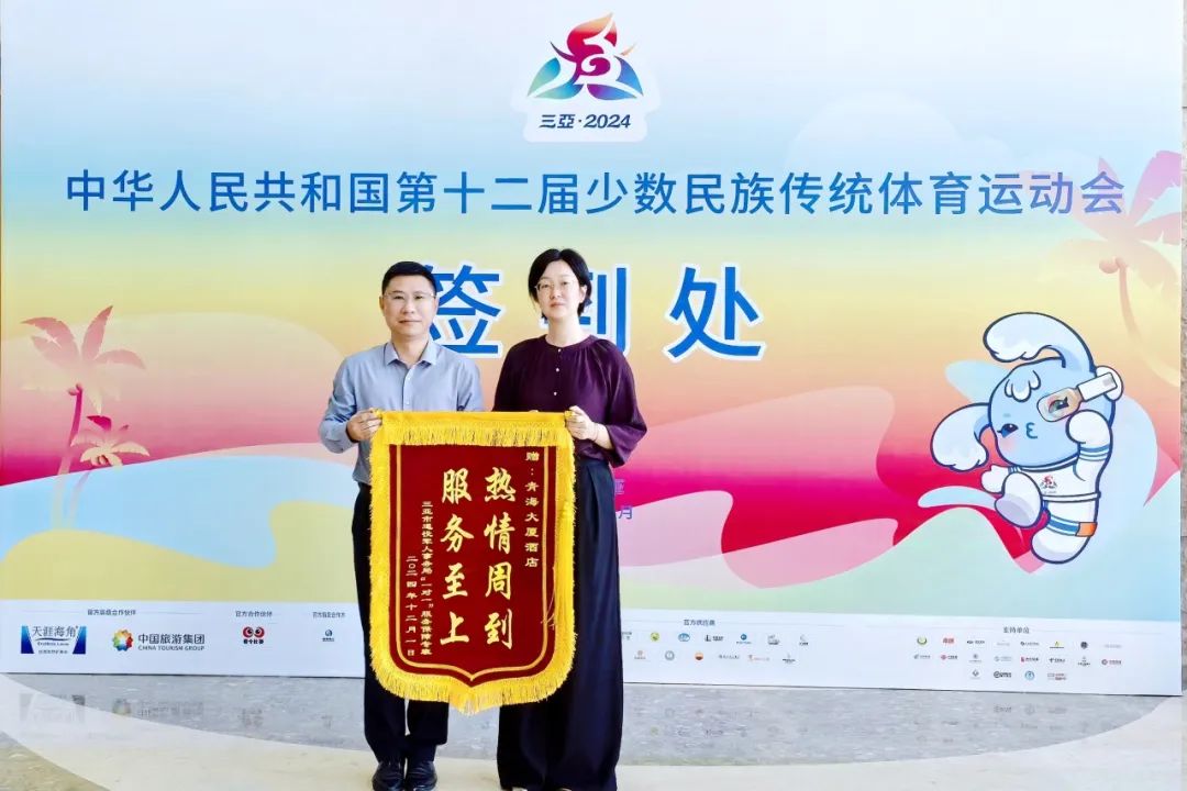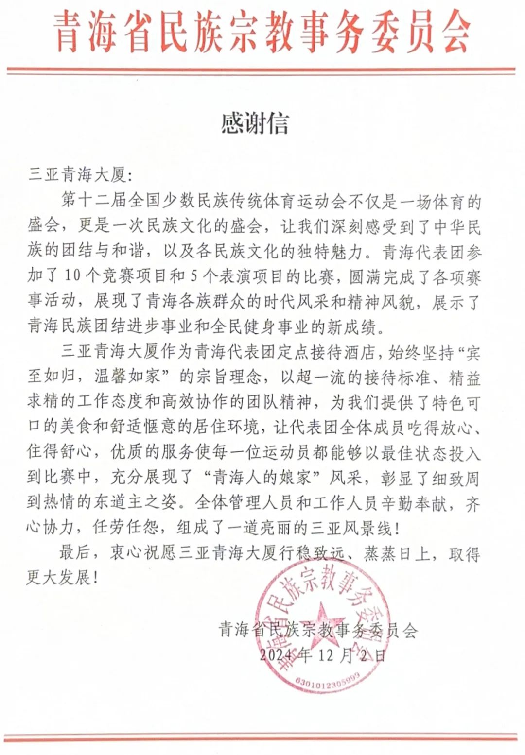 “特色可口的美食和舒適愜意的居住環(huán)境,讓代表團(tuán)全體成員吃得放心住得舒心,優(yōu)質(zhì)的服務(wù)使每一位運(yùn)動(dòng)員都能夠以最佳狀態(tài)投入到比賽中,充分展現(xiàn)了‘青海人的娘家’風(fēng)采?!?/span>12月2日,青海省民族宗教委員會(huì)向西部礦業(yè)所屬三亞青海大廈發(fā)來感謝信,對(duì)三亞青海大廈在第十二屆全國少數(shù)民族傳統(tǒng)體育運(yùn)動(dòng)會(huì)期間作為青海代表團(tuán)指定接待酒店,以超一流的接待標(biāo)準(zhǔn)、精益求精的工作態(tài)度和高效協(xié)作的團(tuán)隊(duì)精神,為青海代表團(tuán)提供的周到服務(wù)表示感謝。同時(shí),三亞市退役軍人事務(wù)局、第十二屆全國少數(shù)民族傳統(tǒng)體育運(yùn)動(dòng)會(huì)青海代表團(tuán)也送來錦旗,感謝三亞青海大廈的周到服務(wù)。