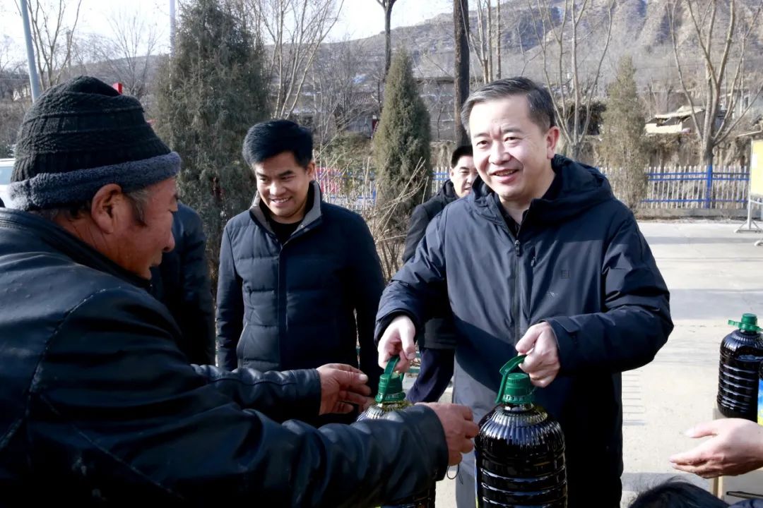 在東至溝村,王海豐與大通縣副縣長(zhǎng)車賢仁、朔北鄉(xiāng)黨委書記郭春輝,三個(gè)聯(lián)點(diǎn)村村主任以及駐村工作隊(duì)員圍坐一起交流,介紹公司近年來(lái)發(fā)展情況,詳細(xì)了解東至溝村、麻家莊村及小龍?jiān)捍迦齻€(gè)聯(lián)點(diǎn)幫扶村工作、村集體經(jīng)濟(jì)發(fā)展等情況,向東至溝村民現(xiàn)場(chǎng)發(fā)放由公司投資修建的鄉(xiāng)村振興產(chǎn)業(yè)發(fā)展項(xiàng)目——東至溝村、麻家莊村綠色生態(tài)植物油加工項(xiàng)目生產(chǎn)的“朔鄉(xiāng)雨露”牌土榨濃香菜籽油。