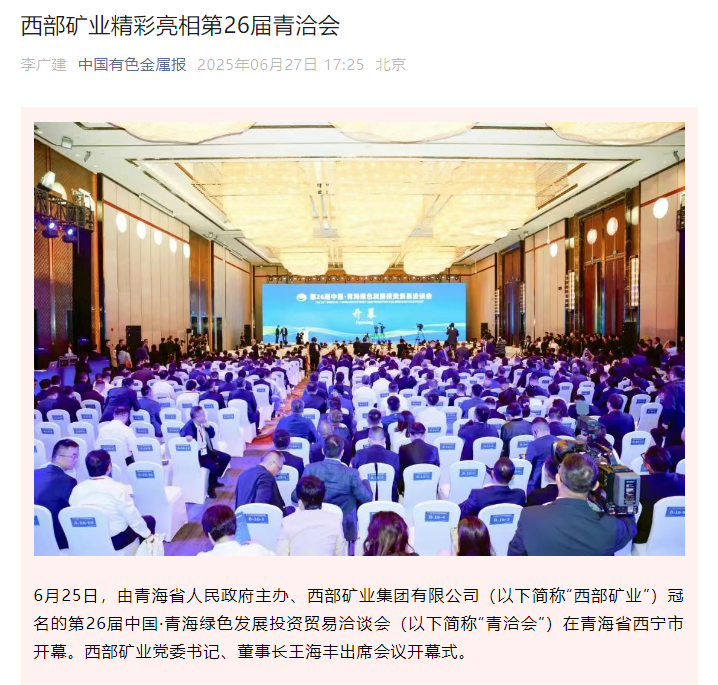 ????6月25日,由青海省人民政府主辦、西部礦業(yè)集團(tuán)有限公司(以下簡稱“西部礦業(yè)”)冠名的第26屆中國·青海綠色發(fā)展投資貿(mào)易洽談會(以下簡稱“青洽會”)在青海省西寧市開幕。西部礦業(yè)黨委書記、董事長王海豐出席會議開幕式。西部礦業(yè)黨委書記、董事長王海豐(中)出席會議開幕式