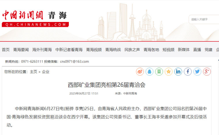 中新網(wǎng)青海新聞6月27日電(楊驊 李雋)25日,由青海省人民政府主辦,西部礦業(yè)集團(tuán)公司冠名的第26屆中國(guó)·青海綠色發(fā)展投資貿(mào)易洽談會(huì)在西寧開(kāi)幕。該集團(tuán)公司黨委書記、董事長(zhǎng)王海豐受邀參加開(kāi)幕式及后續(xù)活動(dòng)。