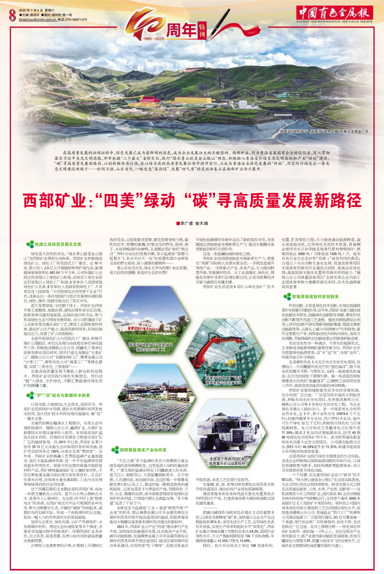????一個個場景,見證著西部礦業(yè)奮力“轉(zhuǎn)身”的不懈實踐?!熬G水青山就是金山銀山”在這里實踐落地,生態(tài)文明紅利在這里持續(xù)釋放,轉(zhuǎn)變發(fā)展方式之路在這里越走越寬。山美、水美、產(chǎn)業(yè)美、創(chuàng)新美……近距離觀察今日之西部礦業(yè),國內(nèi)首條5G全自動智能化鋅冶煉熔鑄產(chǎn)線順暢運行,全球首個海拔5000米高原礦區(qū)無人駕駛礦卡來回穿梭,釩科技公司國內(nèi)首條綠色環(huán)保石煤提釩工藝達到國際領(lǐng)先水平,高效推進錫鐵山分公司、青海鹽業(yè)“黑燈工廠”和湘和公司清潔能源工廠示范項目建設(shè),5G信號覆蓋每一個巷道,現(xiàn)代化冶煉廠房機械轟鳴、晝夜不停,光伏矩陣在廠區(qū)空地、房頂上熠熠生輝……陽光灑在西部礦業(yè)煥然一新的每一寸熱土上,處處呈現(xiàn)老產(chǎn)業(yè)煥發(fā)新活力、新產(chǎn)業(yè)激發(fā)新動能的美麗畫卷,處處閃耀綠色與智慧共舞、質(zhì)量與效率齊飛的發(fā)展光芒,正闊步走在智慧綠色高質(zhì)量發(fā)展的大道上。