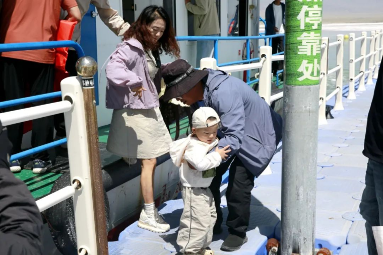 工作人員把小游客抱下游船
