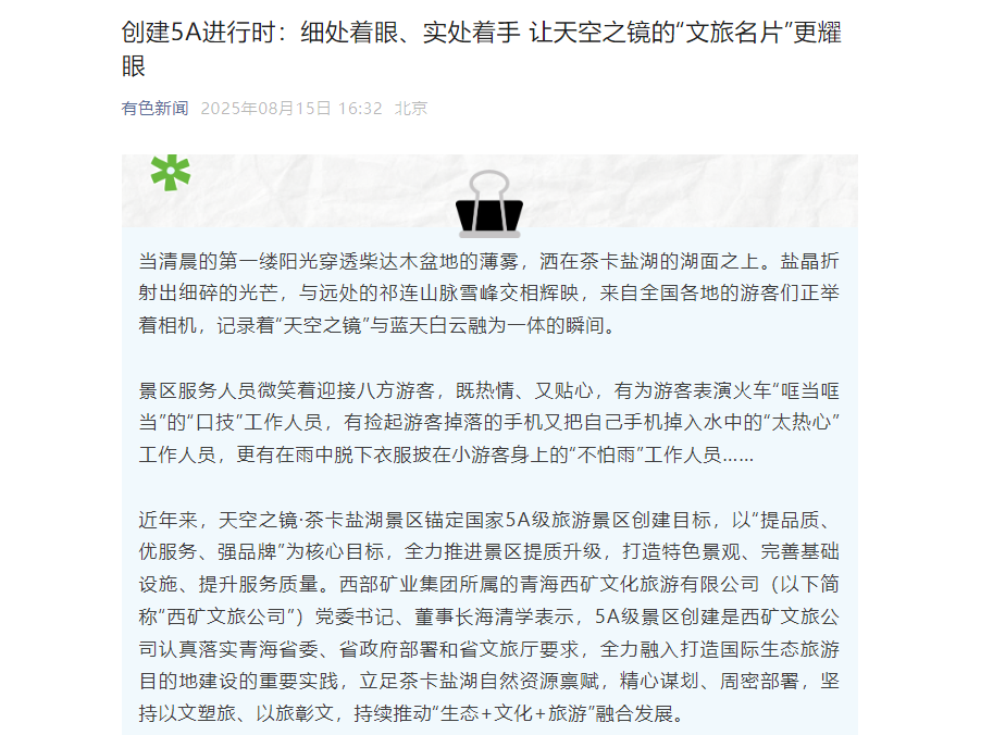 近年來,天空之鏡·茶卡鹽湖景區(qū)錨定國(guó)家5A級(jí)旅游景區(qū)創(chuàng)建目標(biāo),以“提品質(zhì)、優(yōu)服務(wù)、強(qiáng)品牌”為核心目標(biāo),全力推進(jìn)景區(qū)提質(zhì)升級(jí),打造特色景觀、完善基礎(chǔ)設(shè)施、提升服務(wù)質(zhì)量。西部礦業(yè)集團(tuán)所屬的青海西礦文化旅游有限公司(以下簡(jiǎn)稱“西礦文旅公司”)黨委書記、董事長(zhǎng)海清學(xué)表示,5A級(jí)景區(qū)創(chuàng)建是西礦文旅公司認(rèn)真落實(shí)青海省委、省政府部署和省文旅廳要求,全力融入打造國(guó)際生態(tài)旅游目的地建設(shè)的重要實(shí)踐,立足茶卡鹽湖自然資源稟賦,精心謀劃、周密部署,堅(jiān)持以文塑旅、以旅彰文,持續(xù)推動(dòng)“生態(tài)+文化+旅游”融合發(fā)展。