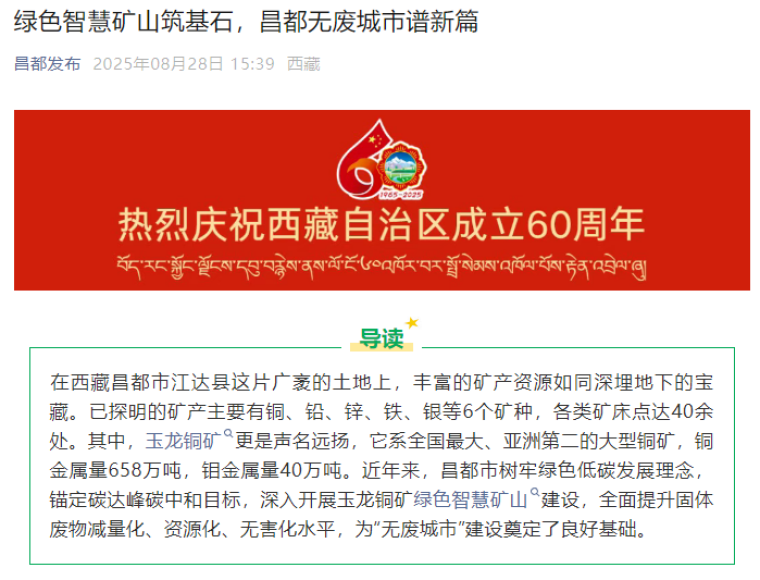 在西藏昌都市江達(dá)縣這片廣袤的土地上,豐富的礦產(chǎn)資源如同深埋地下的寶藏。已探明的礦產(chǎn)主要有銅、鉛、鋅、鐵、銀等6個(gè)礦種,各類礦床點(diǎn)達(dá)40余處。其中,玉龍銅礦更是聲名遠(yuǎn)揚(yáng),它系全國(guó)最大、亞洲第二的大型銅礦,銅金屬量658萬(wàn)噸,鉬金屬量40萬(wàn)噸。近年來(lái),昌都市樹牢綠色低碳發(fā)展理念,錨定碳達(dá)峰碳中和目標(biāo),深入開(kāi)展玉龍銅礦綠色智慧礦山建設(shè),全面提升固體廢物減量化、資源化、無(wú)害化水平,為“無(wú)廢城市”建設(shè)奠定了良好基礎(chǔ)。