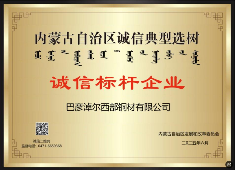 西部銅材訊? 近日,內(nèi)蒙古自治區(qū)發(fā)展和改革委員會(huì)發(fā)布2025年度“誠(chéng)信標(biāo)桿企業(yè)”榜單,巴彥淖爾西部銅材有限公司憑借多年誠(chéng)信經(jīng)營(yíng)根基,從全區(qū)眾多實(shí)力強(qiáng)勁參評(píng)企業(yè)中脫穎而出入選。此次登榜,標(biāo)志著公司繼成功獲評(píng)“自治區(qū)誠(chéng)信達(dá)標(biāo)企業(yè)”“誠(chéng)信示范企業(yè)”后,在誠(chéng)信體系建設(shè)、創(chuàng)新動(dòng)能激發(fā)與社會(huì)責(zé)任擔(dān)當(dāng)?shù)牡缆飞希~入全區(qū)行業(yè)標(biāo)桿領(lǐng)跑方陣。