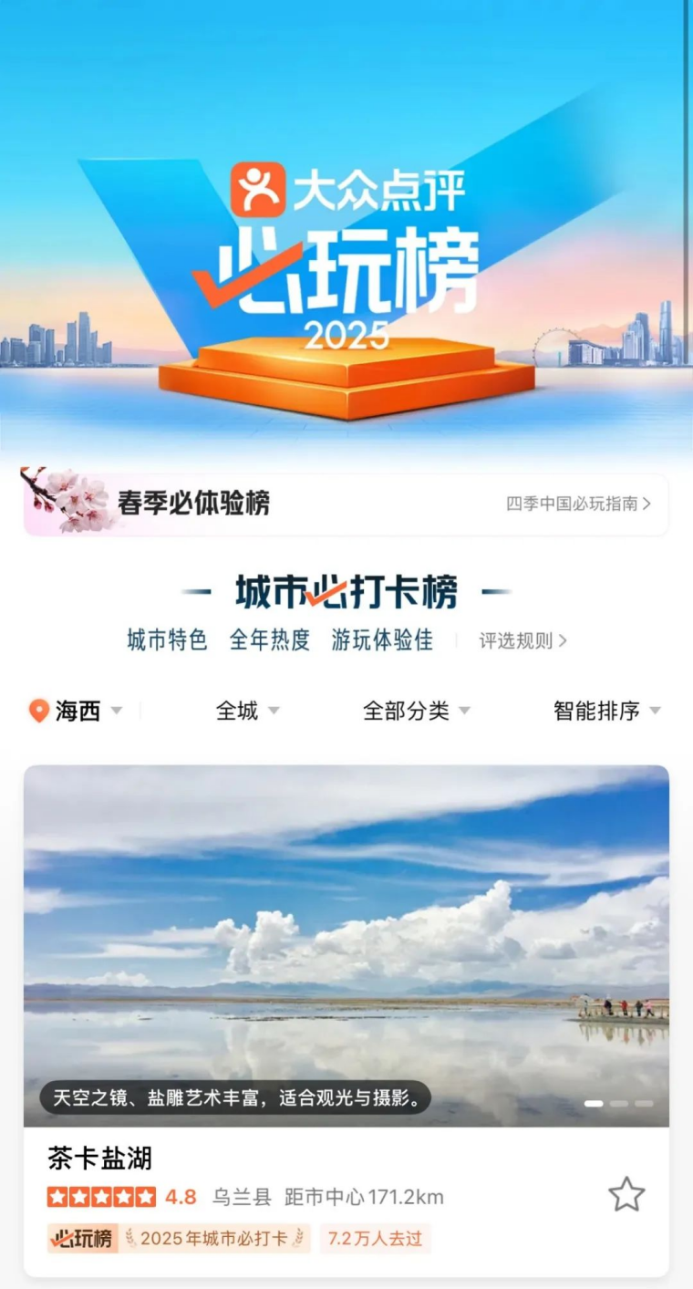 西礦智旅訊(張錦帆) ?近日,國(guó)民生活消費(fèi)權(quán)威平臺(tái)大眾點(diǎn)評(píng)正式發(fā)布“2025必玩榜”,青海茶卡鹽湖景區(qū)憑借持續(xù)高漲的用戶口碑與消費(fèi)熱度,實(shí)力登榜“城市必打卡榜”。這不僅是茶卡鹽湖因“天空之鏡”爆紅以來(lái),十年間從現(xiàn)象級(jí)網(wǎng)紅景點(diǎn)向品質(zhì)化旅游標(biāo)桿的蛻變見(jiàn)證,更是以“生態(tài)保護(hù)+沉浸體驗(yàn)”的創(chuàng)新模式,為全國(guó)文旅行業(yè)樹(shù)立了可持續(xù)發(fā)展的典范。