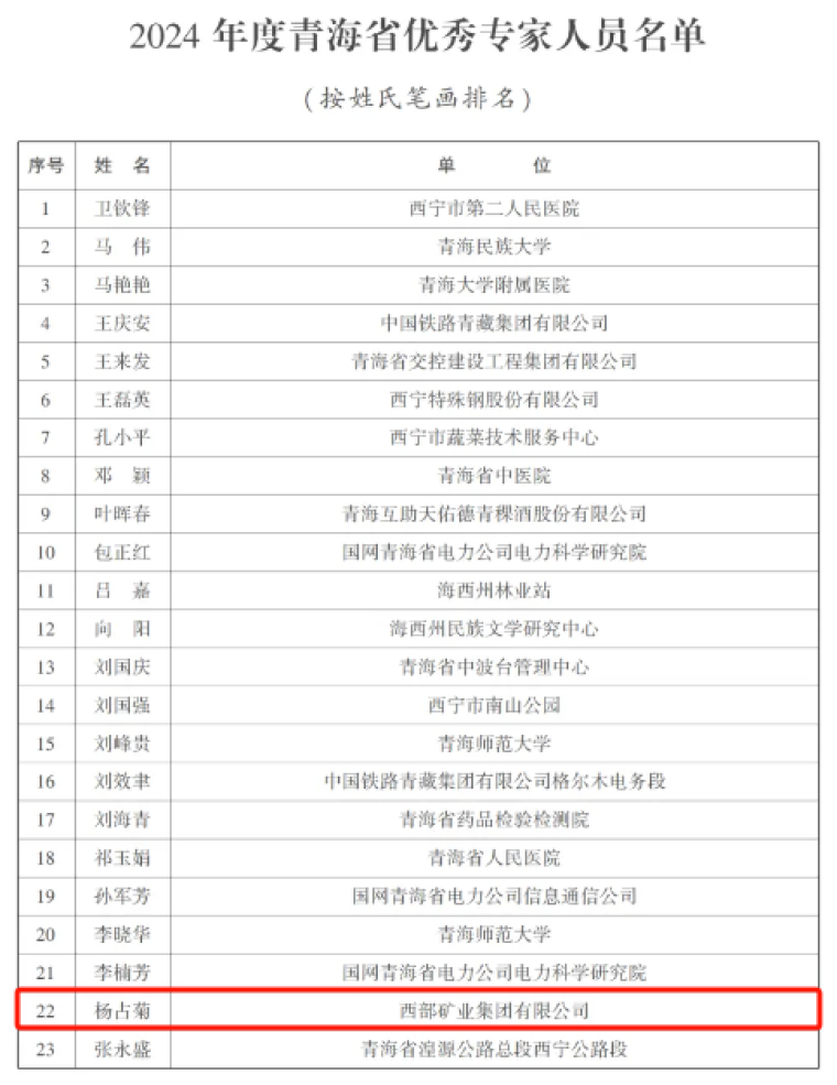 宣傳部訊 ?近日,青海省人民政府下發(fā)《關(guān)于授予衛(wèi)欽鋒等40人2024年度青海省優(yōu)秀專家稱號(hào)的決定》,公司所屬西礦同鑫化工公司員工楊占菊入選。