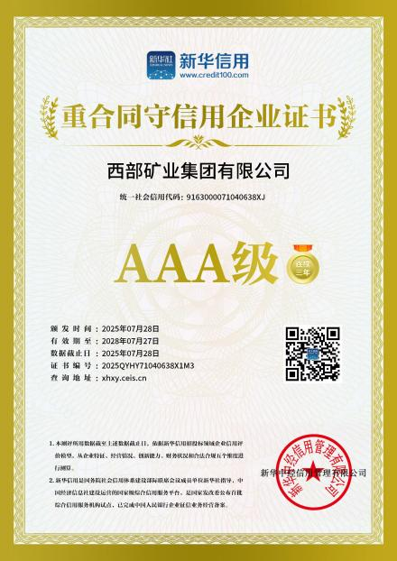 董事會事務(wù)部訊? 近日,西部礦業(yè)集團有限公司憑借在經(jīng)營管理、合同履約、信用管理等方面的優(yōu)秀表現(xiàn),經(jīng)國家級綜合信用服務(wù)平臺新華社新華信用嚴(yán)格評審并公示,評獲“AAA企業(yè)信用等級證書、AAA重合同守信用企業(yè)證書、AAA資信等級證書”認證,為企業(yè)進一步提升品牌影響力和競爭力注入新動能。