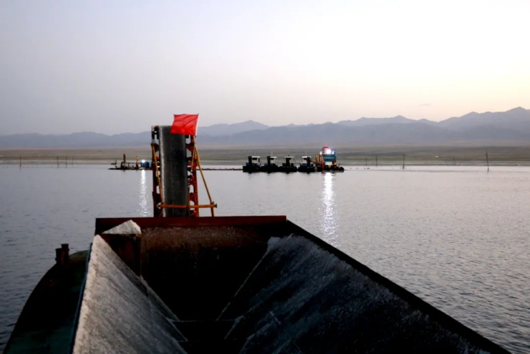 晨霧還未散盡的清晨,抑或是滿天星斗的深夜,廣袤鹽湖響起機器的轟鳴。雙刀輪采鹽船是一頭鋼筋鐵骨的巨獸,穩(wěn)穩(wěn)伏在泛著粼光的鹵水之上,刃口劃破水面,攪起混著鹽晶的漿狀鹽鹵,船身中部的抽吸管道大口吞咽著鹽漿,管道內(nèi)壁上很快凝出薄薄一層白霜,鹽漿在艙內(nèi)經(jīng)過初步過濾,多余的鹵水順著船舷的導(dǎo)流槽回流湖面,留下的濕鹽堆在艙底,漸漸漫出淺淡的鹽香。