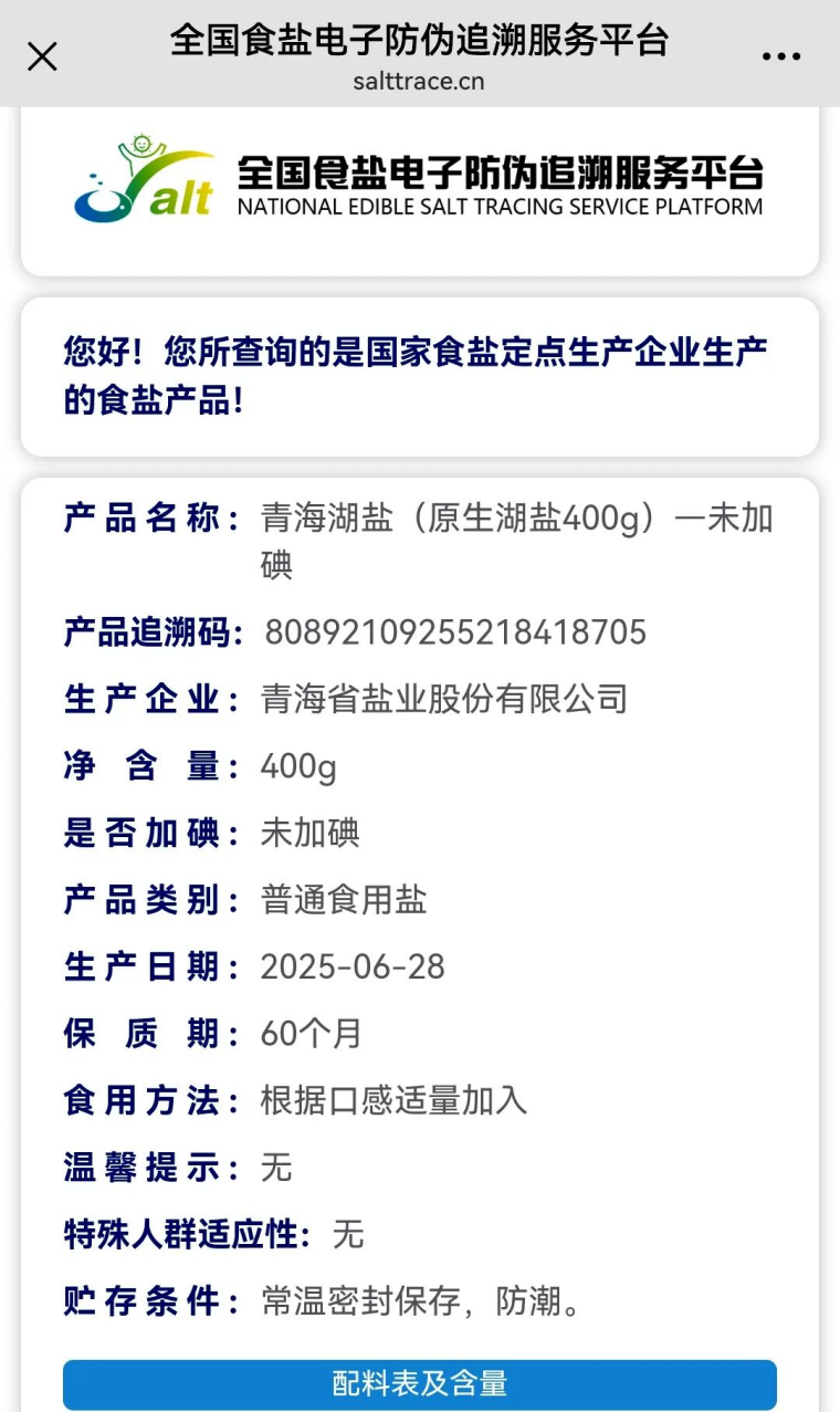 我來自哪里?我又為何驕傲?一個小小的二維碼給了我答案,也給了我驕傲的底氣。手機輕掃登錄全國食鹽電子防偽追溯服務(wù)平臺,我的家鄉(xiāng)、我的姓名、我的年齡便一覽無余。