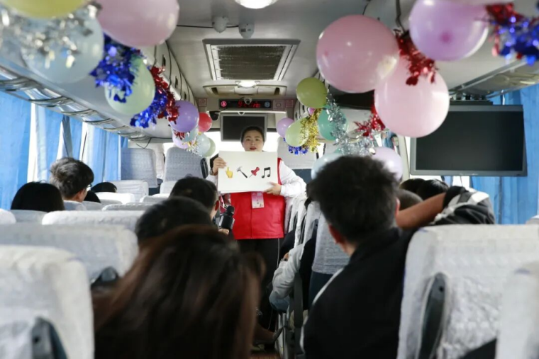 共赴新程,暖意啟航,廣大青年在笑聲盈盈的大巴上破冰。從自我介紹到“擊鼓傳花”“數(shù)字炸彈”等歡快的游戲,現(xiàn)場(chǎng)氣氛迅速升溫。大家在歡笑與掌聲中逐漸放開(kāi)自己,稍顯陌生的面孔也逐漸變得親切起來(lái)。歌曲接龍、猜詞游戲等互動(dòng)環(huán)節(jié)更是將現(xiàn)場(chǎng)氣氛推向了高潮,大家在一場(chǎng)接一場(chǎng)的游戲中熟悉了彼此,也將緣分牽起。