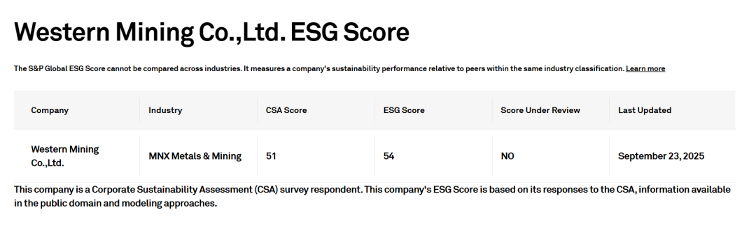 董事會事務(wù)部訊? 近日,全球最主要的評級公司標(biāo)普全球更新ESG評分,西部礦業(yè)得分名列前茅,持續(xù)升高至54分(CSA Score 51,ESG Score 54),超越全球84%礦業(yè)企業(yè)。今年4月,公司還憑借在環(huán)境、社會及公司治理(ESG)方面的杰出表現(xiàn)成功入選《可持續(xù)發(fā)展年鑒(中國版)2025》。