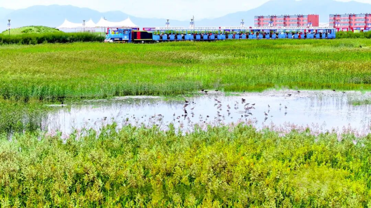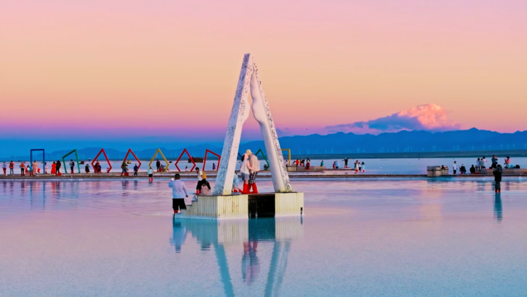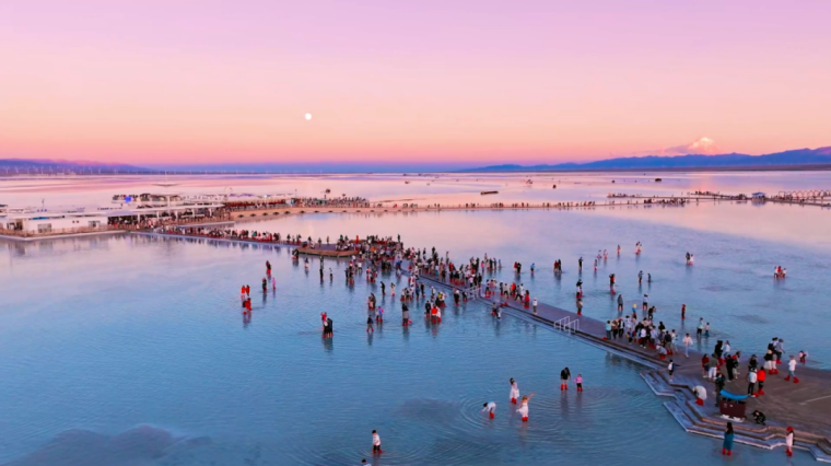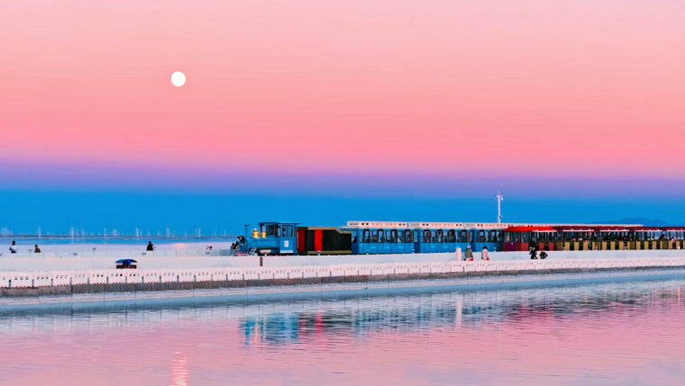 粉色,是天空賦予的景象。當(dāng)太陽(yáng)逐漸西沉,金色、紅色余暉灑在廣闊的鹽湖上,湖面的折射顯現(xiàn)粉色的天空,與正在行進(jìn)的小火車構(gòu)成了一幅絕美的畫卷,讓人不禁感嘆大自然的鬼斧神工。