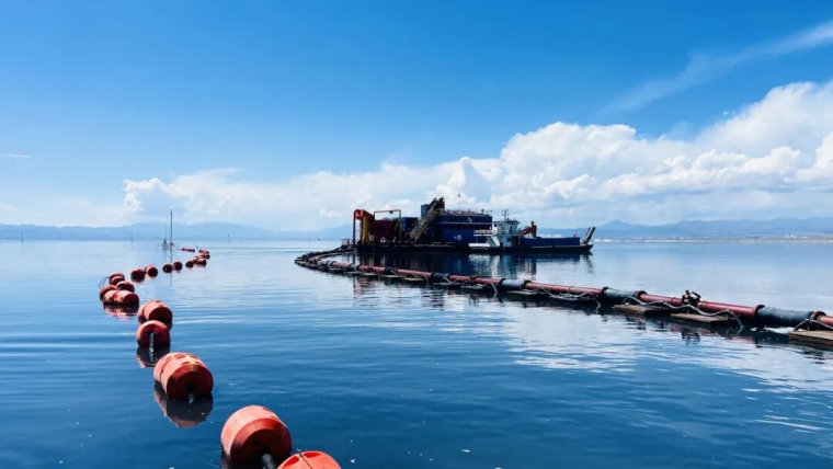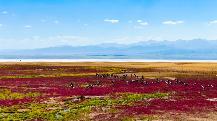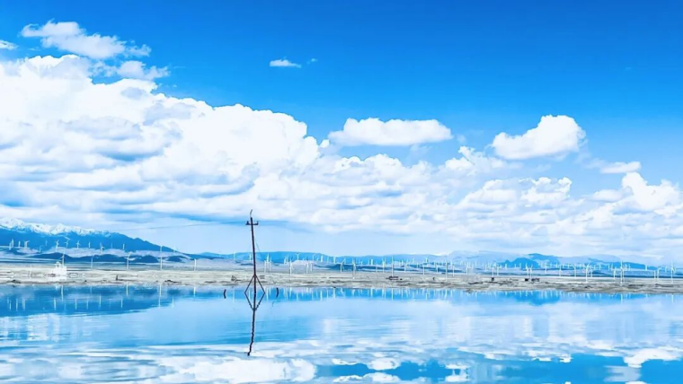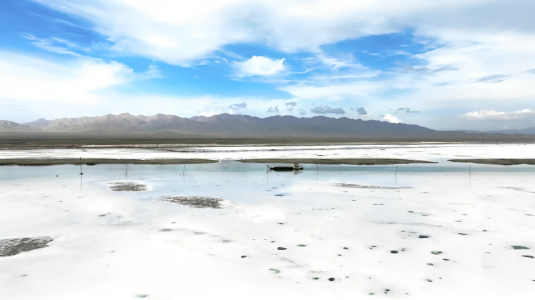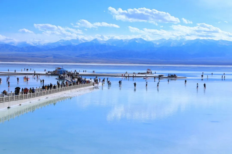 藍(lán)色,是純凈的天空之鏡。當(dāng)清澈的湖水倒映著云朵和山峰,茶卡鹽湖被染成靜謐的藍(lán)色,天空與湖面融為一體,如夢(mèng)如幻,宛如踏入神秘的藍(lán)色星球,水映天、天接地、人在湖間走,宛如畫中游。當(dāng)雙刀輪采鹽船從藍(lán)調(diào)的鹽湖中將粒粒大青鹽采擷而出,在藍(lán)色的湖面上,構(gòu)成一幅美輪美奐的畫面。